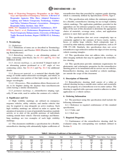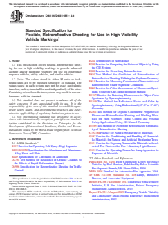 ASTM D8514/D8514M-23 is a technical specification published by ASTM International. Its full title is "Standard Specification for Flexible, Retroreflective Sheeting for Use in High Visibility Vehicle Markings". This standard covers: SCOPE 1.1 This specification covers flexible, retroreflective sheeting for use in high visibility markings to provide enhanced daytime and/or nighttime visibility for use on emergency response vehicles, utility vehicles, and similar vehicles. 1.2 Units—The values stated in either SI units or inch-pound units are to be regarded separately as standard. The values stated in each system may not be exact equivalents; therefore, each system shall be used independently of the other. Combining values from the two systems may result in nonconformance with the standard. 1.3 This standard does not purport to address all of the safety concerns, if any, associated with its use. It is the responsibility of the user of this standard to establish appropriate safety, health, and environmental practices and determine the applicability of regulatory limitations prior to use. 1.4 This international standard was developed in accordance with internationally recognized principles on standardization established in the Decision on Principles for the Development of International Standards, Guides and Recommendations issued by the World Trade Organization Technical Barriers to Trade (TBT) Committee.