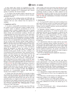 SIGNIFICANCE AND USE 5.1 In order to estimate ETS concentrations, there needs to be a marker or tracer for ETS that is unique or highly specific to tobacco smoke, in sufficient concentrations in air to be measured easily at realistic smoking rates, and in constant proportion to the other components of ETS for a variety of tobacco blends and environmental conditions. Nicotine and 3-ethenylpyridine have been used as tracers of the vapor phase of ETS. Nicotine is the major alkaloid of tobacco and a major constituent of ETS. The determination of nicotine concentration has often been used to estimate the concentration of ETS; however, due to its unpredictable decay kinetics, nicotine may not be an ideal tracer. Because nicotine readily adsorbs to building materials and room furnishings and is depleted from ETS at a rate faster than most other components, some have suggested that nicotine concentrations underestimate ETS concentrations. Although this is true in many environments during the generation of smoke, the converse is true in environments with a recent past history of smoking. The adsorbed nicotine slowly desorbs over time, resulting in an overestimation of ETS concentrations. Thus, measured concentrations of nicotine precisely assess only airborne nicotine and indicate only that smoking has taken place; they do not necessarily indicate the presence, and certainly not the concentrations, of other ETS constituents. 3-Ethenylpyridine, on the other hand, has been shown to track exactly the vapor phase of ETS as measured by CO and FID response (3). It is for these reasons that 3-ethenylpyridine may be a better tracer of ETS (1, 4, 5). The ETS at high concentrations is known to be annoying and irritating to individuals, and concerns over potential health effects have also been expressed. There is a definite need to have reliable methods for the estimation of ETS levels in order to evaluate its effect. The NIOSH has previously set a recommended exposure limit (REL) for nicotine in the workp... SCOPE 1.1 This test method covers the sampling/analysis of nicotine and 3-ethenylpyridine (3-EP) in indoor air. This test method is based upon the collection of nicotine and 3-EP by adsorption on a sorbent resin, extraction of nicotine and 3-EP from the sorbent resin, and determination by gas chromatography (GC) with nitrogen selective detection (1).2 1.2 The active samplers consist of an macroreticular polystyrene-divinylbenzene copolymer (for example, XAD-4) sorbent tube attached to a sampling pump. Macroreticular polystyrene-divinylbenzene copolymer is referred to “sorbent resin” throughout this method. This test method is applicable to personal or area sampling. 1.3 This test method is limited in sample duration by the capacity of the sorbent tube for nicotine (about 300 μg). This test method has been evaluated up to 24-h sample duration; however, samples are typically acquired for at least 1 h (sometimes only 1 h) (2). 1.4 For this test method, limits of detection (LOD) and quantitation (LOQ) for nicotine at a sampling rate of 1.5 L/min are, respectively, 0.11 μg/m3 and 0.37 μg/m 3 for 1-h sample duration and 0.01 μg/m3 and 0.05 μg/m3 for 8-h sample duration. The LOD and LOQ for 3-EP at a sampling rate of 1.5 L/min are, respectively, 0.06 μg/m 3 and 0.19 μg/m3 for 1-h sample duration and 0.01 μg/m3 and 0.02 μg/m3 for 8-h sample duration (2). Both LOD and LOQ can be reduced by increasing the sensitivity of the thermionic specific detector. 1.5 Units—The values stated in SI units are to be regarded as standard. No other units of measurement are included in this standard. 1.6 This standard does not purport to address all of the safety concerns, if any, associated with its use. It is the responsibility of the user of this standard to establish appropriate safety, health, and environmental practices and determine the applicability of regulatory limitations prior to use. Specific precautionary infor...