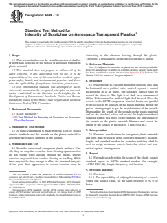 ASTM F548-19 is a standard published by ASTM International. Its full title is "Standard Test Method for Intensity of Scratches on Aerospace Transparent Plastics". This standard covers: SIGNIFICANCE AND USE 4.1 Scratches exist on all transparent plastic surfaces. Usually they are very fine scratches from cleaning operations that are not visible when looking through the plastic. Deeper scratches may result from careless cleaning or handling. While these may not be deep enough to affect the structural integrity of the part, their appearance in certain locations may be distracting to the observer looking through the plastic. Therefore, a procedure to define these scratches is useful. SCOPE 1.1 This test method covers the visual inspection of shallow or superficial scratches on the surface of aerospace transparent plastic materials. 1.2 This standard does not purport to address all of the safety concerns, if any, associated with its use. It is the responsibility of the user of this standard to establish appropriate safety, health, and environmental practices and determine the applicability of regulatory limitations prior to use. 1.3 This international standard was developed in accordance with internationally recognized principles on standardization established in the Decision on Principles for the Development of International Standards, Guides and Recommendations issued by the World Trade Organization Technical Barriers to Trade (TBT) Committee.