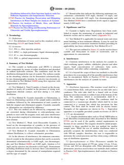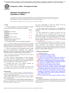 The standard outlines several analytical methods-including distillation, colorimetry, titration, ion-selective electrode measurement, and ion chromatography-for quantifying different forms of cyanide. It is applicable to a wide range of water types, from reagent water to industrial effluents. Safety, sample handling, and interference elimination are emphasized due to the hazardous nature of cyanide and its analytical complexity.