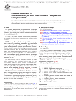 ASTM D6761-22a is a standard published by ASTM International. Its full title is "Standard Test Method for Determination of the Total Pore Volume of Catalysts and Catalyst Carriers". This standard covers: SIGNIFICANCE AND USE 5.1 This test method provides for the measurement of volume of pores that are in the range of catalytic importance and possibly for adsorption processes. This test method requires the use of mercury in order to perform the measurements. SCOPE 1.1 This test method covers the determination of the total pore volume of catalysts and catalyst carriers, that is, the volume of pores having pore diameter between approximately 14 µm and 0.4 nm (4 Å). 1.2 Units—The values stated in SI units are to be regarded as standard. No other units of measurement are included in this standard. 1.3 Warning—Mercury has been designated by many regulatory agencies as a hazardous material that can cause central nervous system, kidney, and liver damage. Mercury, or its vapor, may be hazardous to health and corrosive to materials. Caution should be taken when handling mercury and mercury containing products. See the applicable product Material Safety Data Sheet (MSDS) for details and EPA’s website—http://www.epa.gov/mercury/faq.htm—for additional information. Users should be aware that selling mercury or mercury containing products, or both, into your state or country may be prohibited by law. 1.4 This standard does not purport to address all of the safety concerns, if any, associated with its use. It is the responsibility of the user of this standard to establish appropriate safety, health, and environmental practices and determine the applicability of regulatory limitations prior to use. Specific hazard statements are given in Section 8. Warning statements are given in 10.1.4, 10.1.7, and 10.1.11. 1.5 This international standard was developed in accordance with internationally recognized principles on standardization established in the Decision on Principles for the Development of International Standards, Guides and Recommendations issued by the World Trade Organization Technical Barriers to Trade (TBT) Committee.
