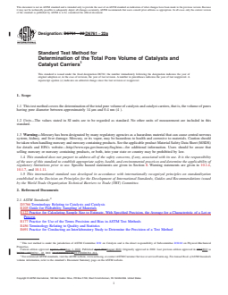 1.1 This test method covers the determination of the total pore volume of catalysts and catalyst carriers, that is, the volume of pores having pore diameter between approximately 14 µm and 0.4 nm (4 Å).