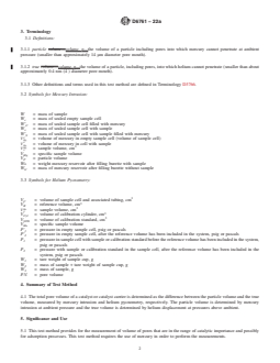 SIGNIFICANCE AND USE 5.1 This test method provides for the measurement of volume of pores that are in the range of catalytic importance and possibly for adsorption processes. This test method requires the use of mercury in order to perform the measurements. SCOPE 1.1 This test method covers the determination of the total pore volume of catalysts and catalyst carriers, that is, the volume of pores having pore diameter between approximately 14 µm and 0.4 nm (4 Å). 1.2 Units—The values stated in SI units are to be regarded as standard. No other units of measurement are included in this standard. 1.3 Warning—Mercury has been designated by many regulatory agencies as a hazardous material that can cause central nervous system, kidney, and liver damage. Mercury, or its vapor, may be hazardous to health and corrosive to materials. Caution should be taken when handling mercury and mercury containing products. See the applicable product Material Safety Data Sheet (MSDS) for details and EPA’s website—http://www.epa.gov/mercury/faq.htm—for additional information. Users should be aware that selling mercury or mercury containing products, or both, into your state or country may be prohibited by law. 1.4 This standard does not purport to address all of the safety concerns, if any, associated with its use. It is the responsibility of the user of this standard to establish appropriate safety, health, and environmental practices and determine the applicability of regulatory limitations prior to use. Specific hazard statements are given in Section 8. Warning statements are given in 10.1.4, 10.1.7, and 10.1.11. 1.5 This international standard was developed in accordance with internationally recognized principles on standardization established in the Decision on Principles for the Development of International Standards, Guides and Recommendations issued by the World Trade Organization Technical Barriers to Trade (TBT) Committee.