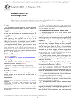 ASTM E2605-13(2019), Standard Practice for Receiving Assets, is an internationally recognized standard developed by ASTM International. This standard provides essential guidance for implementing an effective and efficient system to receive, verify, and document tangible assets-including equipment, supplies, and materials-across any organizational structure. The practice ensures organizations properly manage the receipt of assets by establishing standardized procedures for verification, record-keeping, and reporting, thus supporting asset accountability and operational integrity.