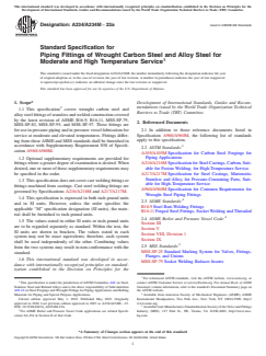 ASTM A234/A234M-23a is a technical specification published by ASTM International. Its full title is "Standard Specification for Piping Fittings of Wrought Carbon Steel and Alloy Steel for Moderate and High Temperature Service". This standard covers: ABSTRACT This specification covers wrought carbon steel and alloy steel fittings of seamless and welded construction. These fittings are for use in pressure piping and in pressure vessel fabrication for service at moderate and elevated temperatures. The material for fittings shall consist of killed steel, forgings, bars, plates, seamless or fusion-welded tubular products with filler metal added. Forging or shaping operations may be performed by hammering, pressing, piercing, extruding, upsetting, rolling, bending, fusion welding, machining, or by a combination of two or more of these operations. The forming procedure shall be so applied that it will not produce injurious imperfections in the fittings. Fittings, after forming at an elevated temperature, shall be cooled to a temperature below the critical range under suitable conditions to prevent injurious defects caused by too rapid cooling, but in no case more rapidly than the cooling rate in still air. The fittings shall be subjected to tension test, hardness test, and hydrostatic test. SCOPE 1.1 This specification2 covers wrought carbon steel and alloy steel fittings of seamless and welded construction covered by the latest revision of ASME B16.9, B16.11, MSS-SP-79, MSS-SP-83, MSS-SP-95, and MSS-SP-97. These fittings are for use in pressure piping and in pressure vessel fabrication for service at moderate and elevated temperatures. Fittings differing from these ASME and MSS standards shall be furnished in accordance with Supplementary Requirement S58 of Specification A960/A960M. 1.2 Optional supplementary requirements are provided for fittings where a greater degree of examination is desired. When desired, one or more of these supplementary requirements may be specified in the order. 1.3 This specification does not cover cast welding fittings or fittings machined from castings. Cast steel welding fittings are governed by Specifications A216/A216M and A217/A217M. 1.4 This specification is expressed in both inch-pound units and in SI units. However, unless the order specifies the applicable “M” specification designation (SI units), the material shall be furnished to inch-pound units. 1.5 The values stated in either SI units or inch-pound units are to be regarded separately as standard. Within the text, the SI units are shown in brackets. The values stated in each system may not be exact equivalents; therefore, each system shall be used independently of the other. Combining values from the two systems may result in non-conformance with the standard. 1.6 This international standard was developed in accordance with internationally recognized principles on standardization established in the Decision on Principles for the Development of International Standards, Guides and Recommendations issued by the World Trade Organization Technical Barriers to Trade (TBT) Committee.