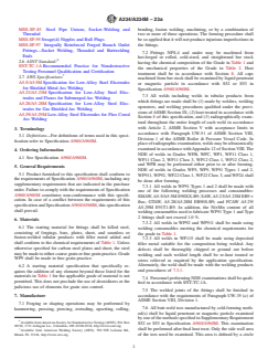 ABSTRACT This specification covers wrought carbon steel and alloy steel fittings of seamless and welded construction. These fittings are for use in pressure piping and in pressure vessel fabrication for service at moderate and elevated temperatures. The material for fittings shall consist of killed steel, forgings, bars, plates, seamless or fusion-welded tubular products with filler metal added. Forging or shaping operations may be performed by hammering, pressing, piercing, extruding, upsetting, rolling, bending, fusion welding, machining, or by a combination of two or more of these operations. The forming procedure shall be so applied that it will not produce injurious imperfections in the fittings. Fittings, after forming at an elevated temperature, shall be cooled to a temperature below the critical range under suitable conditions to prevent injurious defects caused by too rapid cooling, but in no case more rapidly than the cooling rate in still air. The fittings shall be subjected to tension test, hardness test, and hydrostatic test. SCOPE 1.1 This specification2 covers wrought carbon steel and alloy steel fittings of seamless and welded construction covered by the latest revision of ASME B16.9, B16.11, MSS-SP-79, MSS-SP-83, MSS-SP-95, and MSS-SP-97. These fittings are for use in pressure piping and in pressure vessel fabrication for service at moderate and elevated temperatures. Fittings differing from these ASME and MSS standards shall be furnished in accordance with Supplementary Requirement S58 of Specification A960/A960M. 1.2 Optional supplementary requirements are provided for fittings where a greater degree of examination is desired. When desired, one or more of these supplementary requirements may be specified in the order. 1.3 This specification does not cover cast welding fittings or fittings machined from castings. Cast steel welding fittings are governed by Specifications A216/A216M and A217/A217M. 1.4 This specification is expressed in both inch-pound units and in SI units. However, unless the order specifies the applicable “M” specification designation (SI units), the material shall be furnished to inch-pound units. 1.5 The values stated in either SI units or inch-pound units are to be regarded separately as standard. Within the text, the SI units are shown in brackets. The values stated in each system may not be exact equivalents; therefore, each system shall be used independently of the other. Combining values from the two systems may result in non-conformance with the standard. 1.6 This international standard was developed in accordance with internationally recognized principles on standardization established in the Decision on Principles for the Development of International Standards, Guides and Recommendations issued by the World Trade Organization Technical Barriers to Trade (TBT) Committee.