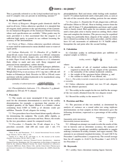SIGNIFICANCE AND USE 4.1 The acidity of a chrome tanning liquor, as determined by this test method, is rarely employed as such. This result is normally combined with the results of a chromium analysis (see Test Method D3898) to determine a property of the liquor called basicity. This property, equal to the percentage by which anions in a normal chromic salt have been replaced by hydroxyl in the solution being analyzed, is closely related to the tanning behavior of the solution. SCOPE 1.1 This test method covers the determination of the titratable acidity of chromium tanning liquors. By titratable acidity is meant not only free acidity, which is rarely present, but also anions combined with weakly basic cations such as Chromium (III), which can be titrated with base at the phenolphthalein end point. 1.2 The values stated in SI units are to be regarded as standard. No other units of measurement are included in this standard. 1.3 This standard does not purport to address all of the safety concerns, if any, associated with its use. It is the responsibility of the user of this standard to establish appropriate safety, health, and environmental practices and determine the applicability of regulatory limitations prior to use. 1.4 This international standard was developed in accordance with internationally recognized principles on standardization established in the Decision on Principles for the Development of International Standards, Guides and Recommendations issued by the World Trade Organization Technical Barriers to Trade (TBT) Committee.