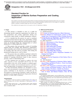 The practice is applicable to new construction, major retrofits, and routine maintenance in the marine industry. While it does not prescribe specific data recording methods or set acceptance criteria, ASTM F941-99(2019) establishes a clear framework for identifying what information should be recorded, when, and by whom. Its primary focus is to provide structure for all stakeholders involved while promoting best practices in marine coatings inspection.