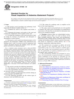 ASTM E1368-23 is a standard published by ASTM International. Its full title is "Standard Practice for Visual Inspection of Asbestos Abatement Projects". This standard covers: SIGNIFICANCE AND USE 5.1 This practice applies to response actions for all types of asbestos-containing materials, including surfacing materials, thermal systems insulation, and miscellaneous materials, whether friable or not, regardless of the quantities involved and the reason for conducting the response action. 5.1.1 Abatement for the purpose of removing asbestos-containing materials or encapsulating or enclosing them, regardless of the engineering controls and work practices used, requires performance of visual inspections as described in this practice. 5.1.2 Operations and maintenance (O&M) activities, such as removal, encapsulation, or enclosure of asbestos-containing materials incidental to repair or replacement of a component, clean-up of debris from a fiber release episode, or other preventive measures, require the performance of visual inspections as described in this practice. See Managing Asbestos in Place7 and Guidance Manual. 5.1.3 This practice applies to response actions performed under a contract from the building owner, as well as to work performed by the building owner's staff. 5.2 The specific objectives of the visual inspection process before, during, and at the conclusion of an asbestos abatement project are: to review the extent of asbestos-containing material (ACM) within the scope of work, to monitor performance of the work, and to verify if visible residue, dust or debris, or unremoved material are absent at the completion of removal and clean-up activities. 5.2.1 The visual inspection process is used to evaluate all four aspects of an asbestos abatement project as follows: 5.2.1.1 Extent of ACM within Scope of Work—The building survey which is intended to locate and quantify asbestos-containing materials is not properly called a “visual inspection” within the context of this practice. To define the extent of ACM involved, a building survey is a necessary prelude to the first step of the visual inspection process. The building survey, which ma... SCOPE 1.1 This practice covers procedures for performing visual inspections of asbestos response actions to: 1.1.1 Establish the extent of the required work before it begins; 1.1.2 Determine the progress and quality of the work and evaluate the completeness of the response action; and 1.1.3 Evaluate the cleanliness of the work area prior to final air testing for clearance (if performed), and subsequent to dismantling of critical barriers. 1.2 This practice can be used on an abatement project, or for operations and maintenance (O&M) work, performed by the building owner's staff. It can also be used in conjunction with contract documents between the building owner and other parties involved in an abatement project. Note 1: Standard contract documents (such as AIA and EJCDC documents) define contractual relationships and responsibilities for projects within the construction industry. Asbestos abatement projects differ from traditional construction projects in the manner of their design and execution, as well as in the type and level of oversight required to substantiate their successful completion. Non-traditional responsibilities are given to the building owner, project designer, and abatement contractor by this practice. Furthermore, responsibilities related to project oversight, inspections, and approvals are placed upon an additional non-traditional representative of the building owner; the project monitor, as defined by this practice. All parties are cautioned that the subject authorities and corresponding responsibilities be understood, mutually agreed upon, and correspondingly addressed with appropriate modifications, if necessary, to the contract documents for a specific project. 1.3 This practice provides the following information: 1.3.1 The objectives of the visual inspection process; 1.3.2 The responsibilities and qualifications of the individuals involved in the visual inspections; 1.3.3 The...
