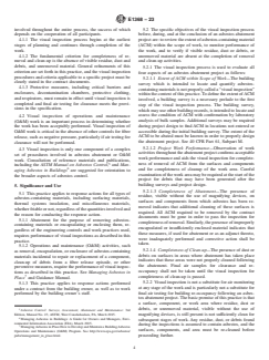5.2 The specific objectives of the visual inspection process before, during, and at the conclusion of an asbestos abatement project are: to review the extent of asbestos-containing material (ACM) within the scope of work, to monitor performance of the work, and to verify if visible residue, dust or debris, or unremoved material are absent at the completion of removal and clean-up activities.