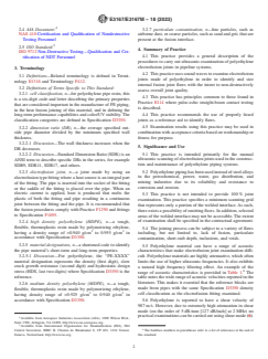 SIGNIFICANCE AND USE 5.1 This practice is intended primarily for the manual ultrasonic scanning of electrofusion joints used in the construction and maintenance of polyethylene piping systems. 5.2 Polyethylene piping has been used instead of steel alloys in the petrochemical, power, water, gas distribution, and mining industries due to its reliability and resistance to corrosion and erosion. 5.3 This practice is not intended to provide 100 % joint examination. This practice specifies a minimum scanning grid that represents only a portion of the welded interface. As such, there exists a possibility of omitting flaws. In addition, selected areas of the welded interface may not be accessible. The extent of examination shall be specified in the contractual agreement. 5.4 The joining process can be subject to a variety of flaws including, but not limited to, lack of fusion, particulate contamination, short-stab depth, inclusions, and voids. 5.5 Polyethylene material can have a range of acoustic characteristics that make electrofusion joint examination difficult. Polyethylene materials are highly attenuative, which often limits the use of higher ultrasonic frequencies. It also exhibits a natural high frequency filtering effect. An example of the range of acoustic characteristics is provided in Table 1.6 The table notes the wide range of acoustic velocities reported in the literature. This makes it essential that the reference blocks are made from pipes with the same Specification D3350 density cell classification as the electrofusion fitting examined. (A) A range of velocity and attenuation values have been noted in the literature (1-9). 5.6 Polyethylene is reported to have a shear velocity of 987 m/s. However, due to extremely high attenuation in shear mode (on the order of 5 dB/mm [127 dB/inch] at 2 MHz) no practical examinations can be carried out using shear mode (6). 5.7 Due to the wide range of applications, joint acceptance criteria for polyethylene pipe are usually ... SCOPE 1.1 This practice establishes a procedure for ultrasonic testing (UT) of electrofusion joints in polyethylene pipe systems. This practice provides one ultrasonic examination procedure for ultrasonic pulse-echo straight beam contact testing, using straight-beam longitudinal waves introduced by direct contact of the search unit with the material being examined. 1.2 The practice is intended to be used on polyethylene electrofusion socket (for example, couplings) and saddle (for example, tees) fittings for use on polyethylene pipe ranging in diameters from nominal 0.5 in. to 12 in. [12 mm to 300 mm] with pipe dimension ratios (DR) ranging from 6.3 to 17. Greater and lesser thicknesses and greater and lesser diameters may be tested using this practice if the technique can be demonstrated to provide adequate detection on mockups of the same wall thickness and geometry. 1.3 This practice does not address ultrasonic examination of butt fusions. Ultrasonic testing of polyethylene butt fusion joints is addressed in Practice E3044/E3044M. Note 1: The notes in this practice are for information only and shall not be considered part of this practice. Note 2: This standard references HDPE and MDPE materials for pipe applications defined by Specification D3350. 1.4 This practice does not specify acceptance criteria. Refer to Specification F1055 and Practice F1290 for destructive acceptance criteria. 1.5 The values stated in either SI units or inch-pound units are to be regarded separately as standard. The values stated in each system are not necessarily exact equivalents; therefore, to ensure conformance with the standard, each system shall be used independently of the other, and values from the two systems shall not be combined. 1.6 This standard does not purport to address all of the safety concerns, if any, associated with its use. It is the responsibility of the user of this standard to establish appropriate safet...