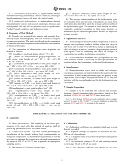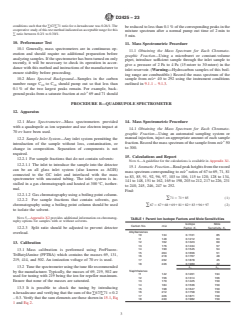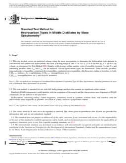 SIGNIFICANCE AND USE 5.1 A knowledge of the hydrocarbon composition of process streams and petroleum products boiling within the range of 160 °C to 343 °C (320 °F to 650 °F) is useful in following the effect of changes in process variables, diagnosing the source of plant upsets, and in evaluating the effect of changes in composition on product performance properties. 5.2 A test method to determine total cycloparafins and low level aromatic content is necessary to meet specifications for aviation turbine fuel containing synthesized hydrocarbons. SCOPE 1.1 This test method covers an analytical scheme using the mass spectrometer to determine the hydrocarbon types present in conventional and synthesized hydrocarbons that have a boiling range of 160 °C to 343 °C (320 °F to 650 °F), 5 % to 95 % by volume as determined by Test Method D86. Samples with average carbon number value of paraffins between C12 and C16 and containing paraffins from C10 and C18 can be analyzed. Eleven hydrocarbon types are determined. These include: paraffins, noncondensed cycloparaffins, condensed dicycloparaffins, condensed tricycloparaffins, alkylbenzenes, indans or tetralins, or both, CnH 2n-10 (indenes, etc.), naphthalenes, CnH2n-14 (acenaphthenes, etc.), CnH 2n-16 (acenaphthylenes, etc.), and tricyclic aromatics. Note 1: This test method was developed on Consolidated Electrodynamics Corporation Type 103 Mass Spectrometers. Operating parameters for users with a Quadrupole Mass Spectrometer are provided. 1.2 This test method is intended for use with full boiling range products that contain no significant olefin content. Biodiesel (FAME components) could interfere with the separation of the sample and the characteristic mass fragments of FAME compounds are not defined in the procedure. Hydrocarbons containing tertiary carbon fragments, sometimes found in synthetic aviation fuels, will interfere with the characteristic mass fragments of paraffins and result in a false, elevated cycloparaffin content. Note 2: “No significant olefin content” for this method means D1319. 1.3 The values stated in SI units are to be regarded as standard. The values given in parentheses after SI units are provided for information only and are not considered standard. 1.4 This standard does not purport to address all of the safety concerns, if any, associated with its use. It is the responsibility of the user of this standard to establish appropriate safety, health, and environmental practices and determine the applicability of regulatory limitations prior to use. For a specific warning statement, see 11.1. 1.5 This international standard was developed in accordance with internationally recognized principles on standardization established in the Decision on Principles for the Development of International Standards, Guides and Recommendations issued by the World Trade Organization Technical Barriers to Trade (TBT) Committee.