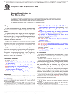 ABSTRACT This specification covers the chemical, mechanical, and physical requirements for available wrought alloy tool steel products. The material shall be made by an electric melting process. It shall be made from ingots that have been reduced in cross section in such a manner and to such a degree as to ensure proper refinement of the ingot structure. Chemical composition, hardness, macrostructure and decarburization of the material shall conform to the requirements in accordance to the referenced ASTM documents itemized herein. SCOPE 1.1 This specification covers the chemical, mechanical, and physical requirements for available wrought alloy tool steel products. 1.2 These products, which include hot or cold finished bar, plate, sheet, strip, rod, wire, or forgings, are normally fabricated into tools, dies, or fixtures. The selection of a material for a particular application will depend upon design, service conditions, and desired properties. 1.3 The values stated in inch-pound units are to be regarded as standard. The values given in parentheses are mathematical conversions to SI units that are provided for information only and are not considered standard. 1.4 This international standard was developed in accordance with internationally recognized principles on standardization established in the Decision on Principles for the Development of International Standards, Guides and Recommendations issued by the World Trade Organization Technical Barriers to Trade (TBT) Committee.