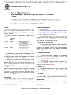 ASTM A529/A529M-19 is a technical specification published by ASTM International. Its full title is "Standard Specification for High-Strength Carbon-Manganese Steel of Structural Quality". This standard covers: ABSTRACT This specification covers high-strength carbon-manganese steel shapes, plates, and bars of structural quality for use in riveted, bolted, or welded construction of buildings and for general structural purposes. Materials considered here are available in Grades 50 [345] and 55 [380]. Steel specimens shall be killed, and as such, be affirmed in the corresponding test report. Heat and product analysis shall be performed wherein steel materials shall conform to the required chemical compositions of carbon, manganese, phosphorus, sulfur, silicon, copper, columbium, chromium, nickel, molybdenum, and vanadium. Steel specimens shall also undergo tensile tests and shall conform to required values of tensile strength, yield strength, and elongation. SCOPE 1.1 This specification covers carbon-manganese steel shapes, plates, and bars of structural quality for use in riveted, bolted, or welded construction of buildings and for general structural purposes. 1.2 Material under this specification is available in two grades: Grade Yield Strength, ksi [MPa] Thickness 50 [345] 50 [345] Plates to 1 in. [25 mm] thick to 15 in. [380 mm] wide Bars to 31/2 in. [90 mm] Shapes with flange or leg thickness to 11/2 in. [40 mm] inclusive 55 [380] 55 [380] Plates to 1 in. [25 mm] thick to 15 in. [380 mm] wide Bars to 3 in. [75 mm] Shapes with flange or leg thickness to 11/2 in. [40 mm] inclusive 1.3 When the steel is to be welded, it is presupposed that a welding procedure suitable for the grade of steel and intended use or service will be utilized. See Appendix X3 of Specification A6/A6M for information on weldability. 1.4 The values stated in either inch-pound units or SI units are to be regarded as standard. Within the text, the SI units are shown in brackets. The values stated in each system are not exact equivalents; therefore, each system must be used independently of the other. 1.5 This international standard was developed in accordance with internationally recognized principles on standardization established in the Decision on Principles for the Development of International Standards, Guides and Recommendations issued by the World Trade Organization Technical Barriers to Trade (TBT) Committee.