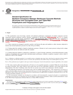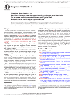 - Scope: Covers resilient connectors for joining reinforced concrete structures (per ASTM C478/C478M and C913) to annular corrugated profile wall HDPE and PP pipes (per ASTM F2306/F2306M, F2648/F2648M, F2763/F2763M, F2764/F2764M, F2881/F2881M, F2947/F2947M).