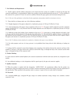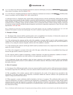 ABSTRACT This specification covers the design, material, and minimum performance requirements of resilient connectors used for connections between reinforced concrete manhole structures and corrugated high density polyethylene drainage pipes. These connectors are designed to provide a positive seal between the pipe and manholes or other structures subjected to internal and external hydrostatic pressures. The design of the connector shall be such that positive seal is accomplished at two locations: (1) between the connector and the wall of the manhole or structure and (2) between the connector and the pipe. The connectors shall be tested for hydrostatic pressure test to meet the requirements prescribed. SCOPE 1.1 This specification covers the design, material, and minimum performance requirements of resilient connectors used for connections between reinforced concrete structures conforming to Specifications C478/C478M and C913 to annular corrugated profile wall high density polyethylene (HDPE) and polypropylene (PP) drainage and sewer pipe conforming to Specifications F2306/F2306M, F2648/F2648M, F2763/F2763M, F2764/F2764M, F2881/F2881M and F2947/F2947M. 1.1.1 These connectors are designed to provide a positive seal between the pipe and manholes or other structures subjected to internal and external hydrostatic pressures less than 10.8 psi [74 KPa]. 1.1.2 Testing under this standard is limited to hydrostatic pressures. Alternate air and vacuum pressure testing involve unique testing protocols and are not addressed under this standard. 1.1.3 Testing under this standard is conducted in a laboratory as a proof of design certification. Actual field performance testing would be accomplished and accepted under individual project performance standards or pipeline acceptance criteria, which is outside the scope of this standard. Note 1: Infiltration or exfiltration quantities for an installed system are dependent upon many factors other than the connections between manhole structures and pipe, and allowable quantities must be covered by other specifications and suitable testing of the installed pipeline and system. Note 2: This specification may be applied to other types of plastic drainage pipe. Consult with manufacturer of pipe for applicability to this standard. 1.2 The values stated in either inch-pound units or SI units are to be regarded separately as standard. Within the text the SI units are shown in brackets. The values stated in each system may not be exact equivalents: therefore, each system shall be used independently of the other. Combining values from the two systems may result in non-conformance with the standard. 1.3 The following precautionary caveat pertains only to the test methods portion, Section 7. This standard does not purport to address all of the safety concerns, if any, associated with its use. It is the responsibility of the user of this standard to establish appropriate safety, health, and environmental practices and determine the applicability of regulatory limitations prior to use. For a specific precaution statement, see 7.2.3. 1.4 This international standard was developed in accordance with internationally recognized principles on standardization established in the Decision on Principles for the Development of International Standards, Guides and Recommendations issued by the World Trade Organization Technical Barriers to Trade (TBT) Committee.