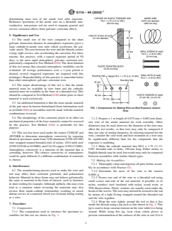 SIGNIFICANCE AND USE 5.1 The small size of the wire compared to the short galvanic interaction distance in atmospheric exposures gives a large cathode-to-anode area ratio which accelerates the galvanic attack. The area between the wire and the threads creates a long, tight crevice, also accelerating the corrosion. For these reasons, this practice, with a typical exposure period of 90 days, is the most rapid atmospheric galvanic corrosion test, particularly compared to Test Method G104. The short duration of this test means that seasonal atmospheric variability can be evaluated. (If average performance over a 1-year period is desired, several staggered exposures are required with this technique.) Reproducibility of this practice is somewhat better than other atmospheric galvanic corrosion tests. 5.2 The major disadvantage of this test is that the anode material must be available in wire form and the cathodic material must be available in the form of a threaded rod. This should be compared to Test Method G104 where plate or sheet material is used exclusively. 5.3 An additional limitation is that the more anodic material of the pair must be known beforehand (from information such as in Guide G82) or assemblies must be made with the material combinations reversed. 5.4 The morphology of the corrosion attack or its effect on mechanical properties of the base materials cannot be assessed by this practice. Test Method G104 is preferable for this purpose. 5.5 This test has been used under the names CLIMAT and ATCORR to determine atmospheric corrosivity by exposing identical specimens made from 1100 aluminum (UNS A91100) wire wrapped around threaded rods of nylon, 1010 mild steel (UNS G10100 or G10080), and CA110 copper (UNS C11000). Atmospheric corrosivity is a function of the material that is corroding, however. The relative corrosivity of atmospheres could be quite different if a different combination of materials is chosen. SCOPE 1.1 This practice covers the evaluation of atmospheric galvanic corrosion of any anodic material that can be made into a wire when in contact with a cathodic material that can be made into a threaded rod. 1.2 When certain materials are used for the anode and cathode, this practice has been used to rate the corrosivity of atmospheres. 1.3 The wire-on-bolt test was first described in 1955 (1),2 and has since been used extensively with standard materials to determine corrosivity of atmospheres under the names CLIMAT Test (CLassify Industrial and Marine ATmospheres) (2-5) and ATCORR (ATmospheric CORRosivity) (6-9). 1.4 The values stated in SI units are to be regarded as standard. No other units of measurement are included in this standard. 1.5 This standard does not purport to address all of the safety concerns, if any, associated with its use. It is the responsibility of the user of this standard to establish appropriate safety, health, and environmental practices and determine the applicability of regulatory limitations prior to use. 1.6 This international standard was developed in accordance with internationally recognized principles on standardization established in the Decision on Principles for the Development of International Standards, Guides and Recommendations issued by the World Trade Organization Technical Barriers to Trade (TBT) Committee.