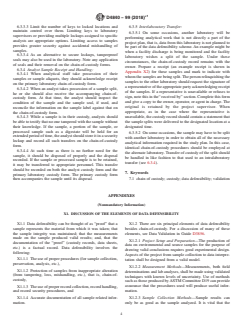 ASTM D4840-99(2018)e1 is a guide published by ASTM International. Its full title is "Standard Guide for Sample Chain-of-Custody Procedures". This standard covers: SIGNIFICANCE AND USE 5.1 Chain-of-custody procedures are a necessary element in a program to assure one’s ability to support data and conclusions adequately from the time samples are collected until sample disposal. In a legal or regulatory situation custody documentation alone is not sufficient. A complete data defensibility scheme should be followed that fits the given situation. 5.2 In applying the sample chain-of-custody procedures in this guide, it is assumed that all of the other elements of data defensibility have been applied, if applicable. 5.3 Because there is no definitive program that guarantees legal defensibility of data integrity in any given situation, this guide provides a description and discussion of a comprehensive list of possible elements of a chain-of-custody program, all of which have been employed in actual programs but are given as options for the development of a specific chain-of-custody program. In addition, within particular chain-of-custody elements, this guide proscribes certain activities to assure that if these options are chosen, they will be implemented properly. SCOPE 1.1 This guide contains a comprehensive discussion of potential requirements, in the analysis of water, for a sample chain-of-custody program and describes the procedures involved in sample chain-of-custody. The purpose of these procedures is to provide accountability for and documentation of sample integrity from the time samples are collected until sample disposal. 1.2 These procedures are intended to document sample possession during each stage of a sample’s life cycle, that is, during collection, shipment, storage, and the process of analysis. 1.3 Sample chain-of-custody is just one aspect of the larger issue of data defensibility (see 3.2.2 and Appendix X1). 1.4 A sufficient chain-of-custody process, that is, one that provides sufficient evidence of sample integrity in a legal or regulatory setting, is situationally dependent. The procedures presented in this guide are generally considered sufficient to assure legal defensibility of sample integrity. In a given situation, less stringent measures may be adequate. It is the responsibility of the users of this guide to determine their exact needs. Legal counsel may be needed to make this determination. 1.5 This standard does not purport to address all of the safety concerns, if any, associated with its use. It is the responsibility of the user of this standard to establish appropriate safety, health, and environmental practices and determine the applicability of regulatory limitations prior to use. 1.6 This international standard was developed in accordance with internationally recognized principles on standardization established in the Decision on Principles for the Development of International Standards, Guides and Recommendations issued by the World Trade Organization Technical Barriers to Trade (TBT) Committee.