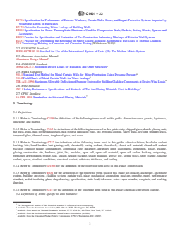 ASTM C1401-23 is a guide published by ASTM International. Its full title is "Standard Guide for Structural Sealant Glazing". This standard covers: SIGNIFICANCE AND USE 5.1 The old saying “A chain is only as strong as its weakest link” is very applicable to a SSG system. In reality, a SSG system, to be successful, must establish and maintain a chain of adhesion. For example, a factory applied finish must adhere adequately to a metal framing member, a structural glazing sealant to that metal finish, that structural glazing sealant to a reflective coating on a glass lite, and lastly, that reflective coating to a glass surface. This guide will assist in the identification and development of, among others, performance criteria, test methods, and industry practices that should be implemented to obtain the required structural glazing sealant adhesion and compatibility with other system components. 5.2 Although this guide has been arranged to permit easy access to specific areas of interest, it is highly recommended that the entire guide is read and understood before establishing the requirements for a particular SSG system. 5.3 This guide should not be the only criteria upon which the design and installation of a SSG system is based. The information herein is provided to assist in the development of a specific program with a goal of achieving a successful SSG system installation. Information and guidelines are provided for the evaluation, design, installation, and maintenance of a SSG system and many of its various components. Considering the range of properties of structural glazing silicone sealants, as well as the many types of framing system designs, material combinations that can be used, various material finishes, and the many types and varieties of accessories, the information contained herein is general in nature. 5.4 Generally, the design, fabrication, and installation of a SSG system requires more technical knowledge and experience then is required for a conventionally glazed window or curtain wall system. To ensure the success of a SSG system, it is important that suppliers, fabricators, and installers of materials an... SCOPE 1.1 Structural sealant glazing, hereinafter referred to as SSG, is an application where a sealant not only can function as a barrier against the passage of air and water through a building envelope, but also primarily provides structural support and attachment of glazing or other components to a window, curtain wall, or other framing system. 1.2 This guide provides information useful to design professionals, manufacturers, contractors, and others for the design and installation of a SSG system. This information is applicable only to this glazing method when used for a building wall that is not more than 15° from vertical; however, limited information is included concerning a sloped SSG application. 1.3 Only a silicone chemically curing sealant specifically formulated, tested, and marketed for structural sealant glazing is acceptable for a SSG system application. 1.4 The committee with jurisdiction for this standard is not aware of any comparable standard published by other organizations. 1.5 The values stated in SI units are to be regarded as standard. The values given in parentheses after SI units are provided for information only and are not considered standard. SI units in this guide are in conformance with IEEE/ASTM SI 10. 1.6 This standard does not purport to address all of the safety concerns, if any, associated with its use. It is the responsibility of the user of this standard to establish appropriate safety, health, and environmental practices and determine the applicability of regulatory limitations prior to use. 1.7 This international standard was developed in accordance with internationally recognized principles on standardization established in the Decision on Principles for the Development of International Standards, Guides and Recommendations issued by the World Trade Organization Technical Barriers to Trade (TBT) Committee.