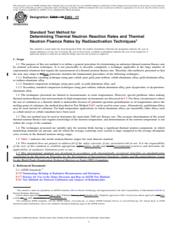 SIGNIFICANCE AND USE 4.1 This test method can be extended to use any material that has the necessary nuclear and activation properties that suit the experimenter's particular situation. No attempt has been made to fully describe the myriad problems of counting techniques, neutron-fluence depression, and thick-foil self-shielding. It is assumed that the experimenter will refer to existing literature on these subjects. This test method does offer a referee technique (the standard gold foil) to aid the experimenter when they are in doubt of their ability to perform the radiometric technique with sufficient accuracy. 4.2 The standard comparison technique uses a set of foils that are as nearly identical as possible in shape and mass. The foils are fabricated from any material that activates by an (n, γ) reaction, preferably having a cross section approximately inversely proportional to neutron speed in the thermal energy range. Some of the foils are irradiated in a known neutron field (at NIST) or other standards laboratory). The foils are counted in a fixed geometry on a stable radiation-detecting instrument. The neutron-induced reaction rate of the foils is computed from the counting data, and the ratio of the known neutron fluence rate to the computed reaction rate is determined. For any given foil, neutron energy spectrum, and counting set-up, this ratio is a constant. Other foils from the identical set can now be exposed to an unknown neutron field. The magnitude of the fluence rate in the unknown field can be obtained by comparing the reaction rates as determined from the counting data from the unknown and reference field, with proper corrections to account for spectral differences between the two fields (see Section 5). One important feature of this technique is that it eliminates the need for knowing the detector efficiency. 4.3 This test method follows the Stoughton and Halperin convention for reporting thermal neutron fluence. Other conventions are the Wescott convention (fol... SCOPE 1.1 The purpose of this test method is to define a general procedure for determining an unknown thermal-neutron fluence rate by neutron activation techniques. It is not practicable to describe completely a technique applicable to the large number of experimental situations that require the measurement of a thermal-neutron fluence rate. Therefore, this method is presented so that the user may adapt to their particular situation the fundamental procedures of the following techniques. 1.1.1 Radiometric counting technique using pure cobalt, pure gold, pure indium, cobalt-aluminum, alloy, gold-aluminum alloy, or indium-aluminum alloy. 1.1.2 Standard comparison technique using pure gold, or gold-aluminum alloy, and 1.1.3 Secondary standard comparison techniques using pure indium, indium-aluminum alloy, pure dysprosium, or dysprosium-aluminum alloy. 1.2 The techniques presented are limited to measurements at room temperatures. However, special problems when making thermal-neutron fluence rate measurements in high-temperature environments are discussed in 9.2. For those circumstances where the use of cadmium as a thermal shield is undesirable because of potential spectrum perturbations or of temperatures above the melting point of cadmium, the method described in Test Method E481 can be used in some cases. Alternatively, gadolinium filters may be used instead of cadmium. For high temperature applications in which aluminum alloys are unsuitable, other alloys such as cobalt-nickel or cobalt-vanadium have been used. 1.3 This test method may be used to determine the equivalent 2200 m/s fluence rate. The accurate determination of the actual thermal neutron fluence rate requires knowledge of the neutron temperature, and determination of the neutron temperature is not within the scope of the standard. 1.4 The techniques presented are suitable only for neutron fields having a significant thermal neutron component, in w...
