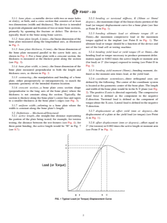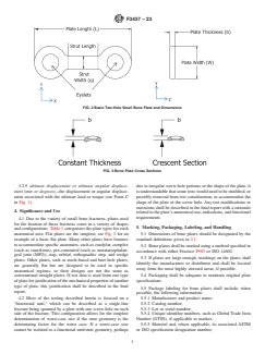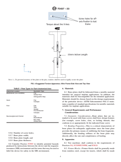 SIGNIFICANCE AND USE 4.1 Due to the variety of small bone fractures, plates used for the fixation of these fractures come in a variety of shapes and configurations. Table 1 categorizes the plate types for each anatomical area. Flat plates are the simplest; see Fig. 2 for an example of a basic flat plate. Many other plates have features to accommodate specific anatomies, such as condylar, complex (such as cuneiform), pre-contoured (such as metatarsophalangeal joint (MPJ)), step, orbital, orthognathic step, and wedge plates. Other plates, such as mesh-based and burr hole plates, are generally flat but are designed to be used in specific anatomical regions, so their designs are not the same as conventional straight plates. If test data is used from one type of plate for justification of the mechanical properties of another type of plate, this justification shall be described in the final report. 4.2 Most of the testing described herein is focused on a “functional unit,” which can be described as a single-line fracture being spanned by a plate with one screw hole on each side of the fracture. This configuration allows for the simplest determination of worst-case size if the strut geometry is the determining factor for the worst case. If a worst-case size cannot be isolated to a functional unit/strut geometry, perhaps due to irregular screw hole patterns or the shape of the plate, it is understandable that some tests would need to be modified, or possibly removed from test consideration, to accommodate the shape of the plate or the screw hole. Any test modifications or omissions shall be described in the final report with a rationale related to the plate’s anatomical use, indications, and functional requirements. SCOPE 1.1 This standard is intended to provide guidance for the static testing of small bone metallic plates used for fracture fixation. Small bone plates referred to in this standard would be used in minimally load-bearing anatomical areas of the far extremities, such as the fingers and toes, and in the cranium and upper face. Lower face/mandible, wrist, and ankle fixation plates would generally be larger and carry a substantial amount of load and should not be evaluated under this standard. 1.2 ASTM Specification F382 and ISO 9585 are currently available for the testing of metallic bone plates as well, so the user can choose to use any of the tests in these standards for small bone plates. However, due to plate size, Specification F382 and ISO 9585 test setup and execution difficulty can be increased for small bone plates. Thus, this standard offers alternative test methods that are more appropriate for metallic bone plates used in small bone fracture fixation. 1.3 This standard is not intended to address the mechanical performance of the plating construct or accessory components (for example, screws and wires). 1.4 This standard is intended to provide a basis for the mechanical comparison of small bone plates. Due to the complex and varying biomechanics found in the areas of the body where these plates are used, this standard should only be used to compare the in vitro mechanical performance of small bone plates and not used to infer in vivo performance characteristics. 1.5 This standard describes static tests by specifying load types and specific methods of applying these loads. Tests for evaluating and characterizing these loads include the following: static torsion, static cantilever beam bending, static lateral bending, and static three-point bending. 1.6 The values stated in SI units are to be regarded as standard. No other units of measurement are included in this standard. 1.7 Multiple tests are cited in this standard. However, it must be noted that the user is not obligated to test using all of the described methods. Instead, the user should only select test methods that are appropriate for a particular device design. 1.8 This standard does not purport to address all of th...
