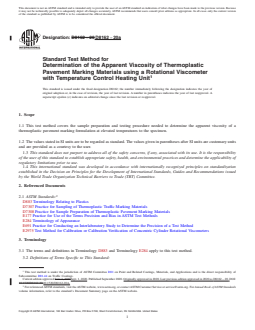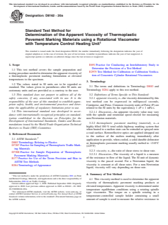 1.1 This test method covers the sample preparation and testing procedure needed to determine the apparent viscosity of a thermoplastic pavement marking formulation at elevated temperatures to the specimen.