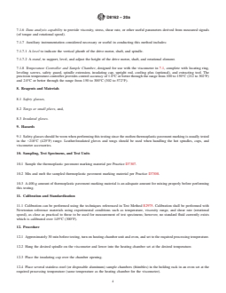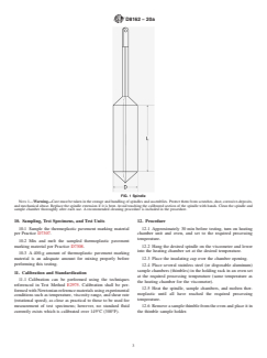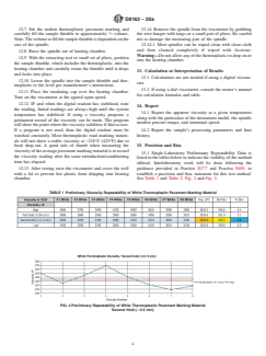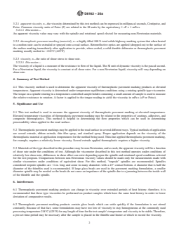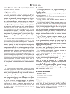 SIGNIFICANCE AND USE 5.1 This test method is used to measure the apparent viscosity of thermoplastic pavement marking at elevated temperatures. Elevated temperature viscosities of thermoplastic pavement marking may be related to the properties of coatings, adhesives, and composite thermoplastics. This method is helpful in determining the flow properties which can be used in determining processability when applied to the road surface. 5.2 Thermoplastic pavement markings may be applied to the road surface in several different ways. Typical methods of application are screed extrude, ribbon extrude, thin film spray, and standard spray. Proper application depends on the viscosity of the thermoplastic material at application temperatures for the method being used. Thin-line applied thermoplastic pavement marking, for example, requires a relatively lower viscosity. Screed extrude applied thermoplastic requires a higher viscosity. 5.3 Materials of the type described in this procedure may be non-Newtonian, and as such, the apparent viscosity will be a function of shear rate under the conditions of test. Although the viscometer described in this test method operates under conditions of relatively low shear rate, differences in shear effect can exist depending upon the spindle and rotational speed conditions selected for the test program. Comparisons between non-Newtonian viscosity values should be made only for measurements made with similar viscometers under conditions of equivalent shear. For this method, “torpedo” spindles are recommended. Spindles considered torpedo spindles are ~1-in. long and come in many diameters with a 45° conical bottom. A diameter that is half the diameter of the thimbles used is recommended. If large glass beads are used in the pavement marking formulation, a smaller diameter spindle may be needed so the beads do not cause an impedance of the spindle due to a jamming between the inside wall of the thimble and the spindle. SCOPE 1.1 This test method covers the sample preparation and testing procedure needed to determine the apparent viscosity of a thermoplastic pavement marking formulation at elevated temperatures to the specimen. 1.2 The values stated in SI units are to be regarded as standard. The values given in parentheses after SI units are customary units and are provided as a courtesy to the user. 1.3 This standard does not purport to address all of the safety concerns, if any, associated with its use. It is the responsibility of the user of this standard to establish appropriate safety, health, and environmental practices and determine the applicability of regulatory limitations prior to use. 1.4 This international standard was developed in accordance with internationally recognized principles on standardization established in the Decision on Principles for the Development of International Standards, Guides and Recommendations issued by the World Trade Organization Technical Barriers to Trade (TBT) Committee.