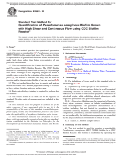 ASTM E2562-22 is a standard published by ASTM International. Its full title is "Standard Test Method for Quantification of <emph type="bdit">Pseudomonas aeruginosa</emph > Biofilm Grown with High Shear and Continuous Flow using CDC Biofilm Reactor". This standard covers: SIGNIFICANCE AND USE 5.1 Bacteria that exist in biofilms are phenotypically different from suspended cells of the same genotype. Research has shown that biofilm bacteria are more difficult to kill than suspended bacteria (5, 7). Laboratory biofilms are engineered in growth reactors designed to produce a specific biofilm type. Altering system parameters will correspondingly result in a change in the biofilm. For example, research has shown that biofilm grown under high shear is more difficult to kill than biofilm grown under low shear (5, 8). The purpose of this test method is to direct a user in the laboratory study of a Pseudomonas aeruginosa biofilm by clearly defining each system parameter. This test method will enable an investigator to grow, sample, and analyze a Pseudomonas aeruginosa biofilm grown under high shear. The biofilm generated in the CDC Biofilm Reactor is also suitable for efficacy testing. After the 48 h growth phase is complete, the user may add the treatment in situ or remove the coupons and treat them individually. SCOPE 1.1 This test method specifies the operational parameters required to grow a reproducible (1)2 Pseudomonas aeruginosa ATCC 700888 biofilm under high shear. The resulting biofilm is representative of generalized situations where biofilm exists under high shear rather than being representative of one particular environment. 1.2 This test method uses the Centers for Disease Control and Prevention (CDC) Biofilm Reactor. The CDC Biofilm Reactor is a continuously stirred tank reactor (CSTR) with high wall shear. Although it was originally designed to model a potable water system for the evaluation of Legionella pneumophila (2), the reactor is versatile and may also be used for growing and/or characterizing biofilm of varying species (3-5). 1.3 This test method describes how to sample and analyze biofilm for viable cells. Biofilm population density is recorded as log10 colony forming units per surface area. 1.4 Basic microbiology training is required to perform this test method. 1.5 The values stated in SI units are to be regarded as standard. No other units of measurement are included in this standard. 1.6 This standard does not purport to address all of the safety concerns, if any, associated with its use. It is the responsibility of the user of this standard to establish appropriate safety and health practices and determine the applicability of regulatory limitations prior to use. 1.7 This international standard was developed in accordance with internationally recognized principles on standardization established in the Decision on Principles for the Development of International Standards, Guides and Recommendations issued by the World Trade Organization Technical Barriers to Trade (TBT) Committee.