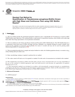 SIGNIFICANCE AND USE 5.1 Bacteria that exist in biofilms are phenotypically different from suspended cells of the same genotype. Research has shown that biofilm bacteria are more difficult to kill than suspended bacteria (5, 7). Laboratory biofilms are engineered in growth reactors designed to produce a specific biofilm type. Altering system parameters will correspondingly result in a change in the biofilm. For example, research has shown that biofilm grown under high shear is more difficult to kill than biofilm grown under low shear (5, 8). The purpose of this test method is to direct a user in the laboratory study of a Pseudomonas aeruginosa biofilm by clearly defining each system parameter. This test method will enable an investigator to grow, sample, and analyze a Pseudomonas aeruginosa biofilm grown under high shear. The biofilm generated in the CDC Biofilm Reactor is also suitable for efficacy testing. After the 48 h growth phase is complete, the user may add the treatment in situ or remove the coupons and treat them individually. SCOPE 1.1 This test method specifies the operational parameters required to grow a reproducible (1)2 Pseudomonas aeruginosa ATCC 700888 biofilm under high shear. The resulting biofilm is representative of generalized situations where biofilm exists under high shear rather than being representative of one particular environment. 1.2 This test method uses the Centers for Disease Control and Prevention (CDC) Biofilm Reactor. The CDC Biofilm Reactor is a continuously stirred tank reactor (CSTR) with high wall shear. Although it was originally designed to model a potable water system for the evaluation of Legionella pneumophila (2), the reactor is versatile and may also be used for growing and/or characterizing biofilm of varying species (3-5). 1.3 This test method describes how to sample and analyze biofilm for viable cells. Biofilm population density is recorded as log10 colony forming units per surface area. 1.4 Basic microbiology training is required to perform this test method. 1.5 The values stated in SI units are to be regarded as standard. No other units of measurement are included in this standard. 1.6 This standard does not purport to address all of the safety concerns, if any, associated with its use. It is the responsibility of the user of this standard to establish appropriate safety and health practices and determine the applicability of regulatory limitations prior to use. 1.7 This international standard was developed in accordance with internationally recognized principles on standardization established in the Decision on Principles for the Development of International Standards, Guides and Recommendations issued by the World Trade Organization Technical Barriers to Trade (TBT) Committee.