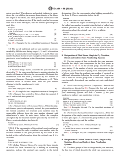 6.3 At first glance, the recommended notation may appear rather involved, but in actuality it is a concise method for describing complex structures. For example, compare the following description of a yarn: “A cabled yarn or cord with a resultant cotton count of 1.4 and 5 turns per inch of Z twist made from 3 strands of plied yarn with 9 turns per inch of S twist each plied from 5 strands of 24 cotton count yarn with 15 turns per inch of Z twist and spun from 11/16 in. staple, graded strict low middling, and having a Micronai...