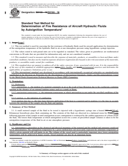 SIGNIFICANCE AND USE 4.1 Autoignition is dependent on the chemical and physical properties of the material and the method and apparatus employed for its determination. The autoignition temperature by a given method does not necessarily represent the minimum temperature at which a given material will self-ignite in air. The volume of the vessel used is particularly important since lower autoignition temperatures will be achieved in larger vessels. Vessel material can also be an important factor. 4.2 The temperatures determined by this test method are those at which air oxidation leads to ignition. These temperatures can be expected to vary with the test pressure and oxygen concentration. 4.3 This test method is not designed for evaluating materials which are capable of exothermic decomposition. For such materials, ignition is dependent upon the thermal and kinetic properties of the decomposition, the mass of the sample, and the heat transfer characteristics of the system. 4.4 This test method is not designed for evaluating for solid chemicals which melt and vaporize or which readily sublime at the test temperature. 4.5 This test method is not designed to measure the autoignition temperature of materials which are solids or liquids at the test temperature (for example, wood, paper, cotton, plastics, and high-boiling point chemicals). Such materials will thermally degrade in the flask and the accumulated degradation products may ignite. 4.6 This test method is not designed to measure the autoignition temperature of chemicals that are gaseous at atmospheric temperature and pressure. SCOPE 1.1 This test method is used for assessing the fire resistance of hydraulic fluids used for aircraft applications by determination of the autoignition temperature of the hydraulic fluid in air at one atmosphere pressure using hypodermic syringe injection. 1.2 The values stated in inch-pound units are to be regarded as standard. The values given in parentheses are mathematical conversions to SI units that are provided for information only and are not considered standard. 1.3 This standard is used to measure and describe the response of materials, products, or assemblies to heat and flame under controlled conditions, but does not by itself incorporate all factors required for fire hazard or fire risk assessment of the materials, products, or assemblies under actual fire conditions. 1.4 This standard does not purport to address all of the safety concerns, if any, associated with its use. It is the responsibility of the user of this standard to establish appropriate safety, health, and environmental practices and determine the applicability of regulatory limitations prior to use. 1.5 This international standard was developed in accordance with internationally recognized principles on standardization established in the Decision on Principles for the Development of International Standards, Guides and Recommendations issued by the World Trade Organization Technical Barriers to Trade (TBT) Committee.