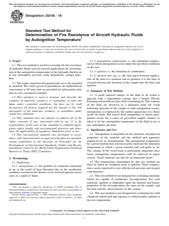 ASTM D2155-18 is a standard published by ASTM International. Its full title is "Standard Test Method for Determination of Fire Resistance of Aircraft Hydraulic Fluids by Autoignition Temperature". This standard covers: SIGNIFICANCE AND USE 4.1 Autoignition is dependent on the chemical and physical properties of the material and the method and apparatus employed for its determination. The autoignition temperature by a given method does not necessarily represent the minimum temperature at which a given material will self-ignite in air. The volume of the vessel used is particularly important since lower autoignition temperatures will be achieved in larger vessels. Vessel material can also be an important factor. 4.2 The temperatures determined by this test method are those at which air oxidation leads to ignition. These temperatures can be expected to vary with the test pressure and oxygen concentration. 4.3 This test method is not designed for evaluating materials which are capable of exothermic decomposition. For such materials, ignition is dependent upon the thermal and kinetic properties of the decomposition, the mass of the sample, and the heat transfer characteristics of the system. 4.4 This test method is not designed for evaluating for solid chemicals which melt and vaporize or which readily sublime at the test temperature. 4.5 This test method is not designed to measure the autoignition temperature of materials which are solids or liquids at the test temperature (for example, wood, paper, cotton, plastics, and high-boiling point chemicals). Such materials will thermally degrade in the flask and the accumulated degradation products may ignite. 4.6 This test method is not designed to measure the autoignition temperature of chemicals that are gaseous at atmospheric temperature and pressure. SCOPE 1.1 This test method is used for assessing the fire resistance of hydraulic fluids used for aircraft applications by determination of the autoignition temperature of the hydraulic fluid in air at one atmosphere pressure using hypodermic syringe injection. 1.2 The values stated in inch-pound units are to be regarded as standard. The values given in parentheses are mathematical conversions to SI units that are provided for information only and are not considered standard. 1.3 This standard is used to measure and describe the response of materials, products, or assemblies to heat and flame under controlled conditions, but does not by itself incorporate all factors required for fire hazard or fire risk assessment of the materials, products, or assemblies under actual fire conditions. 1.4 This standard does not purport to address all of the safety concerns, if any, associated with its use. It is the responsibility of the user of this standard to establish appropriate safety, health, and environmental practices and determine the applicability of regulatory limitations prior to use. 1.5 This international standard was developed in accordance with internationally recognized principles on standardization established in the Decision on Principles for the Development of International Standards, Guides and Recommendations issued by the World Trade Organization Technical Barriers to Trade (TBT) Committee.