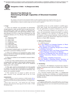 ASTM E1803-14(2022) is a standard published by ASTM International. Its full title is "Standard Test Methods for Determining Strength Capacities of Structural Insulated Panels". This standard covers: SIGNIFICANCE AND USE 5.1 SIPs are used as roof, wall, and floor components in building structures. The structural performance properties need to be determined for design purposes. SCOPE 1.1 These test methods cover procedures for determining strength properties under specified loads for rigid-faced structural insulated panels. These test methods are appropriate for structural insulated panels with rigid facings having a minimum thickness of 0.16 in. (4 mm) and an insulating core with a minimum thickness of 1.5 in. (38 mm). These specified loads include: 1.1.1 Transverse loads, 1.1.2 Axial loads, 1.1.3 Shear loads, 1.1.4 Diaphragm loads, 1.1.5 Uplift loads, 1.1.6 Long Term loads 1.1.7 Impact loads, and 1.1.8 Concentrated loads. 1.2 Structural insulated panels are intended to resist structural loads in permanent building structures. 1.3 These test methods are not intended for quality control purposes and do not evaluate the individual components of the structural insulated panels. 1.4 These test methods are not intended to measure dimensional stability. 1.5 The text of this standard references notes and footnotes, excluding tables and figures, which provide explanatory information. These notes and footnotes shall not be considered requirements of the standard. 1.6 The values stated in inch-pound units are to be regarded as standard. The values given in parentheses are mathematical conversions to SI units that are provided for information only and are not considered standard. 1.7 This standard does not purport to address all of the safety concerns, if any, associated with its use. It is the responsibility of the user of this standard to establish appropriate safety, health, and environmental practices and determine the applicability of regulatory limitations prior to use. 1.8 This international standard was developed in accordance with internationally recognized principles on standardization established in the Decision on Principles for the Development of International Standards, Guides and Recommendations issued by the World Trade Organization Technical Barriers to Trade (TBT) Committee.