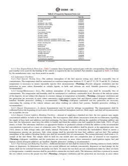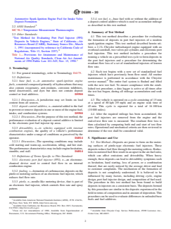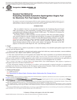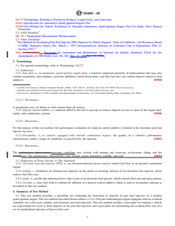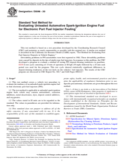SIGNIFICANCE AND USE 5.1 Test Method—Deposits are prone to form on the metering surfaces of pintle-type electronic fuel injectors. These deposits reduce fuel flow through the metering orifices. Reductions in metered fuel flow result in an upset in the air-fuel ratio, which can affect emissions and driveability. When heavy enough, these deposits can lead to driveability symptoms such as hesitation, hard starting, loss of power, or a combination thereof, that are easily noticed by the average driver and lead to customer complaints. The mechanism of the formation of deposits is not completely understood. It is believed to be influenced by many factors, including driving cycle, engine design, port fuel injector design, and composition of fuel used. The procedure in this test method has been found to build deposits in injectors on a consistent basis. The deposits formed by this procedure are similar to the deposits experienced in the field in terms of composition and in amount of deposition. This procedure can be used to evaluate differences in unleaded base fuels and fuel additives. 5.1.1 State and Federal Legislative and Regulatory Action—Legislative and regulatory activity, primarily by the state of California6 and the Federal Government7 necessitate the acceptance of a standard test method to evaluate the port fuel injector deposit-forming tendency of an automotive spark-ignition engine fuel. 5.1.2 Relevance of Results—The operating conditions and design of the engine and vehicle used in this test method are not representative of all modern automobiles. These factors must be considered when interpreting test results. 5.2 Test Validity: 5.2.1 Procedural Compliance—The test results are not considered valid unless the test is completed in compliance with all requirements of this test method. Deviations from the parameter limits presented in Section 10 will result in a void test. Engineering judgment must be applied during conduct of the test method when assessing any anomalies ... SCOPE 1.1 This test method covers a vehicle test procedure to evaluate the tendency of an unleaded spark-ignition engine fuel to foul electronic port fuel injectors (PFI). 1.2 The test method is applicable to unleaded spark-ignition engine fuels which may contain antioxidants, corrosion inhibitors, metal deactivators, dyes, deposit control additives, and oxygenates. 1.3 The values stated in SI units are to be regarded as the standard. The values in parentheses are provided for information only. 1.4 This standard does not purport to address all of the safety concerns, if any, associated with its use. It is the responsibility of the user of this standard to establish appropriate safety, health, and environmental practices and determine the applicability of regulatory limitations prior to use. Specific precautionary statements are given throughout this test method. Note 1: If there is any doubt as to the latest edition of Test Method D5598, contact ASTM Headquarters. Other properties of significance to spark-ignition engine fuel are described in Specification D4814. 1.5 This international standard was developed in accordance with internationally recognized principles on standardization established in the Decision on Principles for the Development of International Standards, Guides and Recommendations issued by the World Trade Organization Technical Barriers to Trade (TBT) Committee.