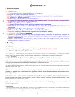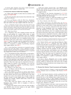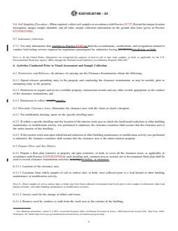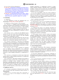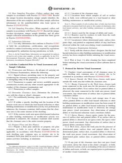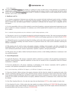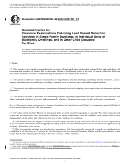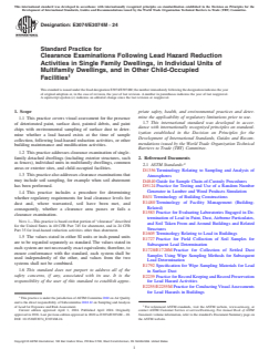 SIGNIFICANCE AND USE 4.1 A clearance examination of abatement areas and other areas associated with other lead-hazard control activities, or building maintenance or modification activities in single-family detached dwellings, individual units in multifamily dwellings, common areas or exterior sites, and child-occupied facilities is performed to determine that the clearance area is adequately safe for reoccupancy. 4.2 It is the responsibility of the user of this standard to assure that all regulatory, contractual and personnel requirements are met prior to conduct of a clearance examination. At a minimum, users of this standard shall be trained in its use and in safe practices for its conduct. Note 2: Authorities having jurisdiction may have certification or specific training requirements, or both. 4.3 This practice is one of a set of standards developed for lead hazard management activities. The visual assessment procedures required in this practice are found in Practice E2255/E2255M and the record keeping requirements are found in Practice E2239. 4.4 Although this practice was primarily developed for dwellings and for other child-occupied facilities, this practice may be also applied to nonresidential buildings and related structures by agreement between the client and the individual conducting the clearance examination. 4.5 This practice may be used by owners and property managers, including owner-occupants, and others responsible for maintaining facilities. It may also be used by lead hazard management consultants, construction contractors, labor groups, real estate and financial professionals, insurance organizations, legislators, regulators, and legal professionals. 4.6 This practice does not address whether lead-hazard reduction activities or other building modification or maintenance work were performed properly. SCOPE 1.1 This practice covers visual assessment for the presence of deteriorated paint, surface dust, painted debris, and paint chips with environmental sampling of surface dust to determine whether a lead hazard exists at the time of sample collection, following lead-hazard reduction activities, or other building maintenance and modification activities. 1.2 This practice addresses clearance examination of single-family detached dwellings (including exterior structures, such as fences), individual units in multifamily dwellings, common areas or exterior sites, and child-occupied facilities. 1.3 This practice also addresses clearance examinations that may include soil sampling, for example when soil abatement has been performed. 1.4 This practice includes a procedure for determining whether regulatory requirements for lead clearance levels for dust and, where warranted, soil have been met, and consequently, whether a clearance area passes or fails a clearance examination. Note 1: This practice is based on that portion of “clearance” described for the United States in 40 CFR Part 745 for abatement, and in 24 CFR Part 35 for lead-hazard reduction activities other than abatement. 1.5 The values stated in either SI units or inch-pound units are to be regarded separately as standard. The values stated in each system are not necessarily exact equivalents; therefore, to ensure conformance with the standard, each system shall be used independently of the other, and values from the two systems shall not be combined. 1.6 This standard does not purport to address all of the safety concerns, if any, associated with its use. It is the responsibility of the user of this standard to establish appropriate safety, health, and environmental practices and determine the applicability of regulatory limitations prior to use. 1.7 This international standard was developed in accordance with internationally recognized principles on standardization established in the Decision on Principles for the Development of International Standards, Guides and Recommendations issued by the World Tr...