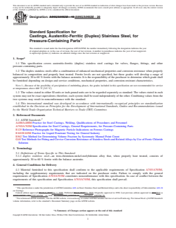 ABSTRACT This specification covers austenitic-ferritic (duplex) stainless steel castings for valves, flanges, fittings, and other pressure-containing parts. The grades of steels covered here are: Grade 1B, Grade 2A, Grade 3A, Grade 4A, Grade 5A, and Grade 6A. The steel castings shall be heat-treated up to required temperature and shall undergo water quenching or rapid cooling by other means after heating. Heat and product analyses shall be performed wherein specimens shall conform to required chemical composition of carbon, manganese, silicon, phosphorus, sulfur, chromium, nickel, molybdenum, copper, tungsten, and nitrogen. All steels shall undergo tension test, and shall conform to the following mechanical requirements: tensile strength, yield strength, and elongation. SCOPE 1.1 This specification covers austenitic-ferritic (duplex) stainless steel castings for valves, flanges, fittings, and other pressure-containing parts. 1.2 The duplex stainless steels offer a combination of enhanced mechanical properties and corrosion resistance when properly balanced in composition and properly heat treated. Ferrite levels are not specified, but these grades will develop a range of approximately 30 to 60 % ferrite with the balance austenite. It is the responsibility of the purchaser to determine which grade shall be furnished depending on design and service conditions, mechanical properties, and corrosion-resistant characteristics. Note 1: Because of the possibility of precipitation of embrittling phases, the grades included in this specification are not recommended for service at temperatures above 600 °F [315 °C]. 1.3 The values stated in either SI units or inch-pound units are to be regarded separately as standard. The values stated in each system may not be exact equivalents; therefore, each system shall be used independently of the other. Combining values from the two systems may result in nonconformance with the standard. 1.4 This international standard was developed in accordance with internationally recognized principles on standardization established in the Decision on Principles for the Development of International Standards, Guides and Recommendations issued by the World Trade Organization Technical Barriers to Trade (TBT) Committee.