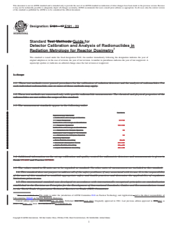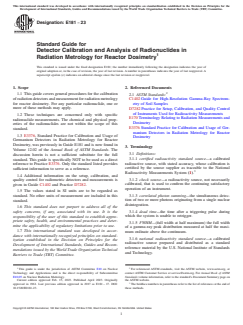 ASTM E181-23 is a standard guide developed by ASTM International that outlines general procedures for the calibration of radiation detectors and the analysis of radionuclides specifically for radiation metrology in reactor dosimetry. This guide focuses on the accurate measurement of radioactivity from specific radionuclides, supporting applications where high precision and reliability are critical. The chemical and physical properties of radionuclides, as well as safety and regulatory guidance, are outside the scope of this document. Instead, the standard concentrates on best practices for the use and calibration of various detector systems and measurement approaches in nuclear science and engineering.