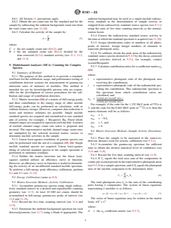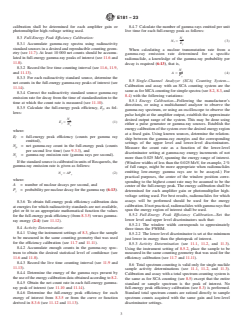 ABSTRACT These methods cover general procedures for the calibration of radiation detectors and the analysis of radionuclides. For each individual radionuclide, one or more of these methods may apply. These methods are concerned only with specific radionuclide measurements. The chemical and physical properties of the radionuclides are beyond the scope of this standard. Among the measurement standards discussed are: the calibration and usage of germanium detectors, scintillation detector systems, scintillation detectors for simple and complex spectra, and counting methods such as beta particle counting, aluminum absorption curve, alpha particle counting, and liquid scintillation counting. For each of the methods, the scope, apparatus used, summary of methods, preparation of apparatus, calibration procedure, measurement of radionuclide, performance testing, sources of uncertainty, precautions and tests, and calculations are detailed. SCOPE 1.1 This guide covers general procedures for the calibration of radiation detectors and measurement for radiation metrology for reactor dosimetry. For any particular radionuclide, one or more of these methods may apply. 1.2 These techniques are concerned only with specific radionuclide measurements. The chemical and physical properties of the radionuclides are not within the scope of this standard. 1.3 E3376, Standard Practice for Calibration and Usage of Germanium Detectors in Radiation Metrology for Reactor Dosimetry, was previously in Guide E181 and is now found in Volume 12.02 of the Annual Book of ASTM Standards. The discussion herein is not a sufficient substitute for the full standard. This guide is specifically NOT to be used as a direct reference to Practice E3376. Only the standard listed provides sufficient information to serve as a reference. 1.4 Additional information on the setup, calibration, and quality control for radiometric detectors and measurements is given in Guide C1402 and Practice D7282. 1.5 The values stated in SI units are to be regarded as standard. No other units of measurement are included in this standard. 1.6 This standard does not purport to address all of the safety concerns, if any, associated with its use. It is the responsibility of the user of this standard to establish appropriate safety, health, and environmental practices and determine the applicability of regulatory limitations prior to use. 1.7 This international standard was developed in accordance with internationally recognized principles on standardization established in the Decision on Principles for the Development of International Standards, Guides and Recommendations issued by the World Trade Organization Technical Barriers to Trade (TBT) Committee.