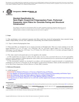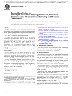 ASTM D8139-23 is a technical specification published by ASTM International. Its full title is "Standard Specification for Semi-Rigid, Closed-Cell Polypropylene Foam, Preformed Expansion Joint Fillers for Concrete Paving and Structural Construction". This standard covers: SCOPE 1.1 This specification covers preformed expansion joint fillers made from closed-cell polypropylene foam materials having suitable compressibility, recovery from compression, nonextruding, and weather-resistant characteristics. 1.1.1 Type I, closed-cell polypropylene foam. 1.2 These joint fillers are intended for use in concrete pavements in full-depth joints. There are several variations in size with typical thicknesses of 1/2 in. (12.7 mm), 3/4 in. (19.05 mm), and 1 in. (25.4 mm); typical widths of 31/2 in. (88.9 mm), 4 in. (101.6 mm), 5 in. (127 mm), 6 in. (152.5 mm), 7 in. (177.8 mm), 8 in. (203.2 mm), or 48 in. (1.2 m) sheet; and typical lengths of 5 ft (1.52 m) and 10 ft (3.05 m). 1.3 The values stated in inch-pound units are to be regarded as the standard. 1.4 This standard does not purport to address all of the safety concerns, if any, associated with its use. It is the responsibility of the user of this standard to establish appropriate safety, health, and environmental practices and determine the applicability of regulatory limitations prior to use. 1.5 This international standard was developed in accordance with internationally recognized principles on standardization established in the Decision on Principles for the Development of International Standards, Guides and Recommendations issued by the World Trade Organization Technical Barriers to Trade (TBT) Committee.