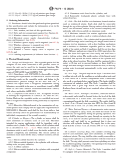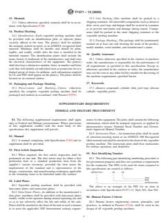 ABSTRACT This specification covers batch-type electric vegetable peeling machines of the following style: Style 1, Size A, and Style 2, Size A, Size B, and Size C. The cylinder or hopper shall be sheet aluminum or stainless steel, or cast iron. Machines intended for marine applications shall be furnished with a stainless steel cylinder. The inside surface of all cylinders shall be covered by silicon carbide or aluminum oxide. The disk shall be cast aluminum, formed stainless steel, or reinforced plastic. The cylinder covering ring shall be cast aluminum, spun sheet aluminum, or fiberglass-reinforced plastic. The supporting base of the flour mounted Style 2 machine shall be steel, aluminum, or stainless steel. The vegetable peeler shall comply to the specified physical requirements specified for the following: (1) cylinder or hopper, (2) disk, (3) vegetable outlet, (4) peel trap, (5) waste outlet, (6) water inlet and sprayer, (7) cylinder covering ring, (8) Style 1, counter mounted, (9) Style 2, floor mounted, (10) waste disposer, (11) electrical devices such as motors, wiring, timer, and switch, and (12) piping, tubing, fittings, and valves. The peeler shall meet the hazard protection requirements including switch guard and shall conform to the performance requirements which shall be tested by operational test. SCOPE 1.1 This specification covers batch-type vegetable peeling machines. 1.2 The values stated in inch-pound units are to be regarded as standard. The values given in parentheses are mathematical conversions to SI units that are provided for information only and are not considered standard. 1.3 The following safety hazards caveat pertains only to the test methods portion, Section 9, of this specification: This standard does not purport to address all of the safety concerns, if any, associated with its use. It is the responsibility of the user of this standard to establish appropriate safety, health, and environmental practices and determine the applicability of regulatory limitations prior to use. 1.4 This international standard was developed in accordance with internationally recognized principles on standardization established in the Decision on Principles for the Development of International Standards, Guides and Recommendations issued by the World Trade Organization Technical Barriers to Trade (TBT) Committee.
