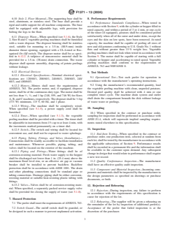 ASTM F1371-13(2024) is a technical specification published by ASTM International. Its full title is "Standard Specification for Vegetable Peeling Machines, Electric". This standard covers: ABSTRACT This specification covers batch-type electric vegetable peeling machines of the following style: Style 1, Size A, and Style 2, Size A, Size B, and Size C. The cylinder or hopper shall be sheet aluminum or stainless steel, or cast iron. Machines intended for marine applications shall be furnished with a stainless steel cylinder. The inside surface of all cylinders shall be covered by silicon carbide or aluminum oxide. The disk shall be cast aluminum, formed stainless steel, or reinforced plastic. The cylinder covering ring shall be cast aluminum, spun sheet aluminum, or fiberglass-reinforced plastic. The supporting base of the flour mounted Style 2 machine shall be steel, aluminum, or stainless steel. The vegetable peeler shall comply to the specified physical requirements specified for the following: (1) cylinder or hopper, (2) disk, (3) vegetable outlet, (4) peel trap, (5) waste outlet, (6) water inlet and sprayer, (7) cylinder covering ring, (8) Style 1, counter mounted, (9) Style 2, floor mounted, (10) waste disposer, (11) electrical devices such as motors, wiring, timer, and switch, and (12) piping, tubing, fittings, and valves. The peeler shall meet the hazard protection requirements including switch guard and shall conform to the performance requirements which shall be tested by operational test. SCOPE 1.1 This specification covers batch-type vegetable peeling machines. 1.2 The values stated in inch-pound units are to be regarded as standard. The values given in parentheses are mathematical conversions to SI units that are provided for information only and are not considered standard. 1.3 The following safety hazards caveat pertains only to the test methods portion, Section 9, of this specification: This standard does not purport to address all of the safety concerns, if any, associated with its use. It is the responsibility of the user of this standard to establish appropriate safety, health, and environmental practices and determine the applicability of regulatory limitations prior to use. 1.4 This international standard was developed in accordance with internationally recognized principles on standardization established in the Decision on Principles for the Development of International Standards, Guides and Recommendations issued by the World Trade Organization Technical Barriers to Trade (TBT) Committee.