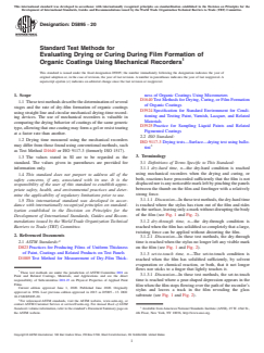 ASTM D5895-20 is a standard published by ASTM International. Its full title is "Standard Test Methods for Evaluating Drying or Curing During Film Formation of Organic Coatings Using Mechanical Recorders". This standard covers: SIGNIFICANCE AND USE 5.1 The drying times of a coating are significant in determining when a freshly painted room, floor or stair may be put back in use or a coated article handled or packaged. Slow drying may result in dirt pick-up or, on an exterior surface, moisture may cause a nonuniform appearance. 5.2 These test methods are used to determine the various stages of drying or curing in the dry-film formation of organic coatings using mechanical devices for the purpose of comparing types of coatings or ingredient changes, or both. To evaluate the stages of drying in a quantitative manner, use of instrumentation under environmental controlled conditions is strongly recommended. These devices also offer a method of determining drying characteristics of coatings that can not be ascertained within the standard 8-h work day. 5.3 When evaluating drying characteristics of baking systems, the circular drying time devices offer a method to determine quantitatively drying times of coatings at room temperature and elevated conditions. Maximum temperatures would be limited by considerations such as the affect of temperature on the motor lubrication or structural components of the device. 5.4 The straight line drying time devices offer a method to determine quantitatively drying times of coatings tested simultaneously using one recorder. 5.5 This method is useful in comparing the behavior of coatings during drying of the same generic type. Determination of actual drying times should be conducted following procedures outlined in Test Method D1640 or ISO 9117-3. SCOPE 1.1 These test methods describe the determination of several stages and the rate of dry-film formation of organic coatings using straight line and circular mechanical drying-time recording devices. The use of mechanical recorders is valuable in comparing the drying behavior of coatings of the same generic type, allowing that one coating may form a gel or resist tearing at a faster rate than another. 1.2 Drying time measured using the mechanical recorders may differ from those found using conventional methods, such as Test Method D1640 or ISO 9117-3 (formerly ISO 1517). 1.3 The values stated in SI are to be regarded as the standard. The values given in parentheses are provided for information only. 1.4 This standard does not purport to address all of the safety concerns, if any, associated with its use. It is the responsibility of the user of this standard to establish appropriate safety, health, and environmental practices and determine the applicability of regulatory limitations prior to use. 1.5 This international standard was developed in accordance with internationally recognized principles on standardization established in the Decision on Principles for the Development of International Standards, Guides and Recommendations issued by the World Trade Organization Technical Barriers to Trade (TBT) Committee.
