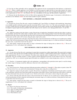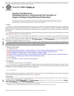 SIGNIFICANCE AND USE 5.1 The drying times of a coating are significant in determining when a freshly painted room, floor or stair may be put back in use or a coated article handled or packaged. Slow drying may result in dirt pick-up or, on an exterior surface, moisture may cause a nonuniform appearance. 5.2 These test methods are used to determine the various stages of drying or curing in the dry-film formation of organic coatings using mechanical devices for the purpose of comparing types of coatings or ingredient changes, or both. To evaluate the stages of drying in a quantitative manner, use of instrumentation under environmental controlled conditions is strongly recommended. These devices also offer a method of determining drying characteristics of coatings that can not be ascertained within the standard 8-h work day. 5.3 When evaluating drying characteristics of baking systems, the circular drying time devices offer a method to determine quantitatively drying times of coatings at room temperature and elevated conditions. Maximum temperatures would be limited by considerations such as the affect of temperature on the motor lubrication or structural components of the device. 5.4 The straight line drying time devices offer a method to determine quantitatively drying times of coatings tested simultaneously using one recorder. 5.5 This method is useful in comparing the behavior of coatings during drying of the same generic type. Determination of actual drying times should be conducted following procedures outlined in Test Method D1640 or ISO 9117-3. SCOPE 1.1 These test methods describe the determination of several stages and the rate of dry-film formation of organic coatings using straight line and circular mechanical drying-time recording devices. The use of mechanical recorders is valuable in comparing the drying behavior of coatings of the same generic type, allowing that one coating may form a gel or resist tearing at a faster rate than another. 1.2 Drying time measured using the mechanical recorders may differ from those found using conventional methods, such as Test Method D1640 or ISO 9117-3 (formerly ISO 1517). 1.3 The values stated in SI are to be regarded as the standard. The values given in parentheses are provided for information only. 1.4 This standard does not purport to address all of the safety concerns, if any, associated with its use. It is the responsibility of the user of this standard to establish appropriate safety, health, and environmental practices and determine the applicability of regulatory limitations prior to use. 1.5 This international standard was developed in accordance with internationally recognized principles on standardization established in the Decision on Principles for the Development of International Standards, Guides and Recommendations issued by the World Trade Organization Technical Barriers to Trade (TBT) Committee.
