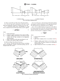 SIGNIFICANCE AND USE 4.1 This practice provides one means for determining the aeroplane structural loads for either dual floats or single hulls when taxiing on, taking off from, or landing on water. This practice satisfies the water loads requirements set forth in the Design Loads and Conditions Specification for Normal Category Aeroplanes. SCOPE 1.1 This practice provides equations for calculating water loads for aeroplane dual floats and single hulls. The material was developed through open consensus of international experts in general aviation. This information was created by focusing on Level 1, 2, 3, and 4 Normal Category aeroplanes. The content may be more broadly applicable; it is the responsibility of the Applicant to substantiate broader applicability as a specific means of compliance. 1.2 An applicant intended to propose this information as Means of Compliance for a design approval must seek guidance from their respective oversight authority (for example, published guidance from applicable CAAs) concerning the acceptable use and application thereof. For information on which oversight authorities have accepted this standard (in whole or in part) as an acceptable Means of Compliance to their regulatory requirements (hereinafter “the Rules”), refer to ASTM Committee F44 web page (www.astm.org/COMMITTEE/F44.htm). 1.3 Units—The values stated in inch-pound units are to be regarded as standard. 1.4 This standard does not purport to address all of the safety concerns, if any, associated with its use. It is the responsibility of the user of this standard to establish appropriate safety, health, and environmental practices and determine the applicability of regulatory limitations prior to use. 1.5 This international standard was developed in accordance with internationally recognized principles on standardization established in the Decision on Principles for the Development of International Standards, Guides and Recommendations issued by the World Trade Organization Technical Barriers to Trade (TBT) Committee.