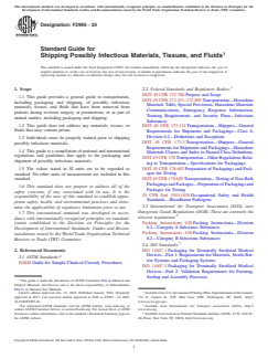 ASTM F2995-24 is a guide published by ASTM International. Its full title is "Standard Guide for Shipping Possibly Infectious Materials, Tissues, and Fluids". This standard covers: SCOPE 1.1 This guide provides a general guide to transportation, including packaging and shipping, of possibly infectious materials, tissues, and fluids that have been removed from patients during revision surgery, at postmortem, or as part of animal studies, including packaging and shipping. 1.2 This guide does not address any materials, tissues, or fluids that may contain prions. 1.3 Individuals must be properly trained prior to shipping possibly infectious materials. 1.4 This guide is a compilation of national and international regulations and guidelines that apply to the packaging and shipment of possibly infectious materials. 1.5 The values stated in SI units are to be regarded as standard. No other units of measurement are included in this standard. 1.6 This standard does not purport to address all of the safety concerns, if any, associated with its use. It is the responsibility of the user of this standard to establish appropriate safety, health, and environmental practices and determine the applicability of regulatory limitations prior to use. 1.7 This international standard was developed in accordance with internationally recognized principles on standardization established in the Decision on Principles for the Development of International Standards, Guides and Recommendations issued by the World Trade Organization Technical Barriers to Trade (TBT) Committee.