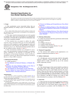 ASTM F30-96(2017), Standard Specification for Iron-Nickel Sealing Alloys, established by ASTM International, provides detailed requirements and characteristics for iron-nickel alloys predominantly used for sealing to glass in electronic applications. This international standard outlines criteria such as chemical composition, surface finish, temper, grain size, and thermal expansion necessary to ensure reliable performance in demanding sealing environments. The specification enhances quality assurance and compatibility for manufacturers and users working with glass-to-metal seals in electronic components.