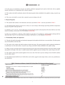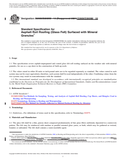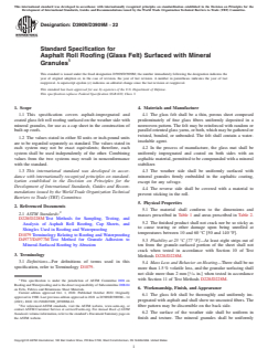 ASTM D3909/D3909M-22 is a technical specification published by ASTM International. Its full title is "Standard Specification for Asphalt Roll Roofing (Glass Felt) Surfaced with Mineral Granules". This standard covers: ABSTRACT This specification covers asphalt-impregnated and coated glass felt roll roofing surfaced on the weather side with mineral granules, for use as a cap sheet in the construction of built-up roofs. The glass felt shall be a thin porous sheet composed predominately of fine glass fibers uniformly deposited in a nonwoven pattern. It shall contain a water-insoluble agent and may be reinforced with random, or parallel oriented glass yarns, or both, which may be gathered or twisted, bonded or unbonded. The products shall meet physical property requirements as to pliability, mass loss and behavior on heating, moisture, and dimensions (width, mass, and area). SCOPE 1.1 This specification covers asphalt-impregnated and coated glass felt roll roofing surfaced on the weather side with mineral granules, for use as a cap sheet in the construction of built-up roofs. 1.2 The values stated in either SI units or inch-pound units are to be regarded separately as standard. The values stated in each system may not be exact equivalents; therefore, each system shall be used independently of the other. Combining values from the two systems may result in nonconformance with the standard. 1.3 This international standard was developed in accordance with internationally recognized principles on standardization established in the Decision on Principles for the Development of International Standards, Guides and Recommendations issued by the World Trade Organization Technical Barriers to Trade (TBT) Committee.