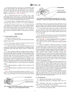 SIGNIFICANCE AND USE 3.1 Grout used in masonry is a fluid mixture of cementitious materials and aggregate with a high water content for ease of placement. 3.1.1 During construction, grout is placed within or between absorptive masonry units. Excess water must be removed from grout specimens in order to provide compressive strength test results more nearly indicative of the grout strength in the wall. In this test method, molds are made from masonry units having the same absorption and moisture content characteristics as those being used in the construction. 3.2 This test method is used to either help select grout proportions by comparing test values or as a quality control test for uniformity of grout preparation during construction. 3.3 The physical exposure condition and curing of the grout are not exactly reproduced, but this test method does subject the grout specimens to absorption conditions similar to those experienced by grout in the wall. Note 2: Test results of grout specimens taken from a wall should not be compared to test results obtained with this test method. SCOPE 1.1 This test method covers procedures for both field and laboratory sampling and compression testing of grout used in masonry construction. Grout for masonry is specified under Specification C476. Note 1: The testing agency performing this test method should be evaluated in accordance with Practice C1093. 1.2 The values stated in inch-pound units are to be regarded as standard. The values given in parentheses are mathematical conversions to SI units that are provided for information only and are not considered standard. 1.3 This standard does not purport to address all of the safety concerns, if any, associated with its use. It is the responsibility of the user of this standard to establish appropriate safety, health, and environmental practices and determine the applicability of regulatory limitations prior to use. 1.4 This international standard was developed in accordance with internationally recognized principles on standardization established in the Decision on Principles for the Development of International Standards, Guides and Recommendations issued by the World Trade Organization Technical Barriers to Trade (TBT) Committee.