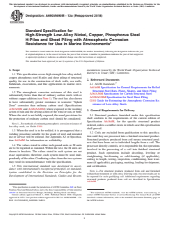 ABSTRACT This specification deals with the standard structural quality of high-strength low-alloy nickel, copper, phosphorus steel H-piles and sheet piling for use in the construction of dock walls, bulkheads, excavations, and like applications in marine environments. The steel shall be semi-killed or killed and shall be exposed to the washing action of rain and the drying action of wind or sun, or both to determine its atmospheric corrosion resistance. Material specimens shall undergo product analysis, heat analysis, and tension testing and shall conform to the required chemical composition, tolerance, tensile strength, yield point, and elongation specifications. SCOPE 1.1 This specification covers high-strength low-alloy nickel, copper, phosphorus steel H-piles and sheet piling of structural quality for use in the construction of dock walls, sea walls, bulkheads, excavations, and like applications in marine environments. 1.2 The atmospheric corrosion resistance of this steel is substantially better than that of ordinary carbon steels with or without copper addition (see Note 1). The steel has also shown to have substantially greater resistance to seawater “Splash Zone” corrosion than ordinary carbon steel (Specifications A36/A36M and A328/A328M) where exposed to the washing action of rain and the drying action of the wind or sun, or both. Where the steel is not boldly exposed, the usual provisions for the protection of ordinary carbon steel should be considered. Note 1: For methods of estimating atmospheric corrosion resistance of low-alloy steels, see Guide G101. 1.3 When the steel is to be welded, it is presupposed that a welding procedure suitable for the grade of steel and intended use or service will be utilized. See Appendix X3 of Specification A6/A6M for information on weldability. 1.4 The values stated in either inch-pound units or SI units are to be regarded as standard. Within the text, the SI units are shown in brackets. The values stated in each system are not exact equivalents; therefore, each system must be used independently of the other. Combining values from the two systems may result in nonconformance with the specification. 1.5 This international standard was developed in accordance with internationally recognized principles on standardization established in the Decision on Principles for the Development of International Standards, Guides and Recommendations issued by the World Trade Organization Technical Barriers to Trade (TBT) Committee.