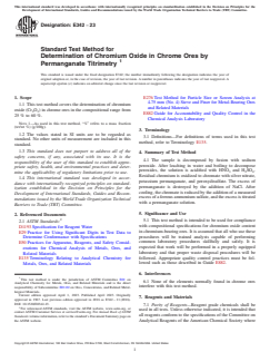 ASTM E342-23: Standard Test Method for Determination of Chromium Oxide in Chrome Ores by Permanganate Titrimetry specifies procedures for accurately measuring the chromium oxide (Cr₂O₃) content in chromium-bearing ores. This standard is essential for compliance with compositional specifications in mining, metallurgy, and quality assurance industries. The method utilizes permanganate titrimetry, providing a reliable measurement of chromium oxide mass fractions ranging from 25% to 60%. All values are expressed in SI units, ensuring consistency in global applications.